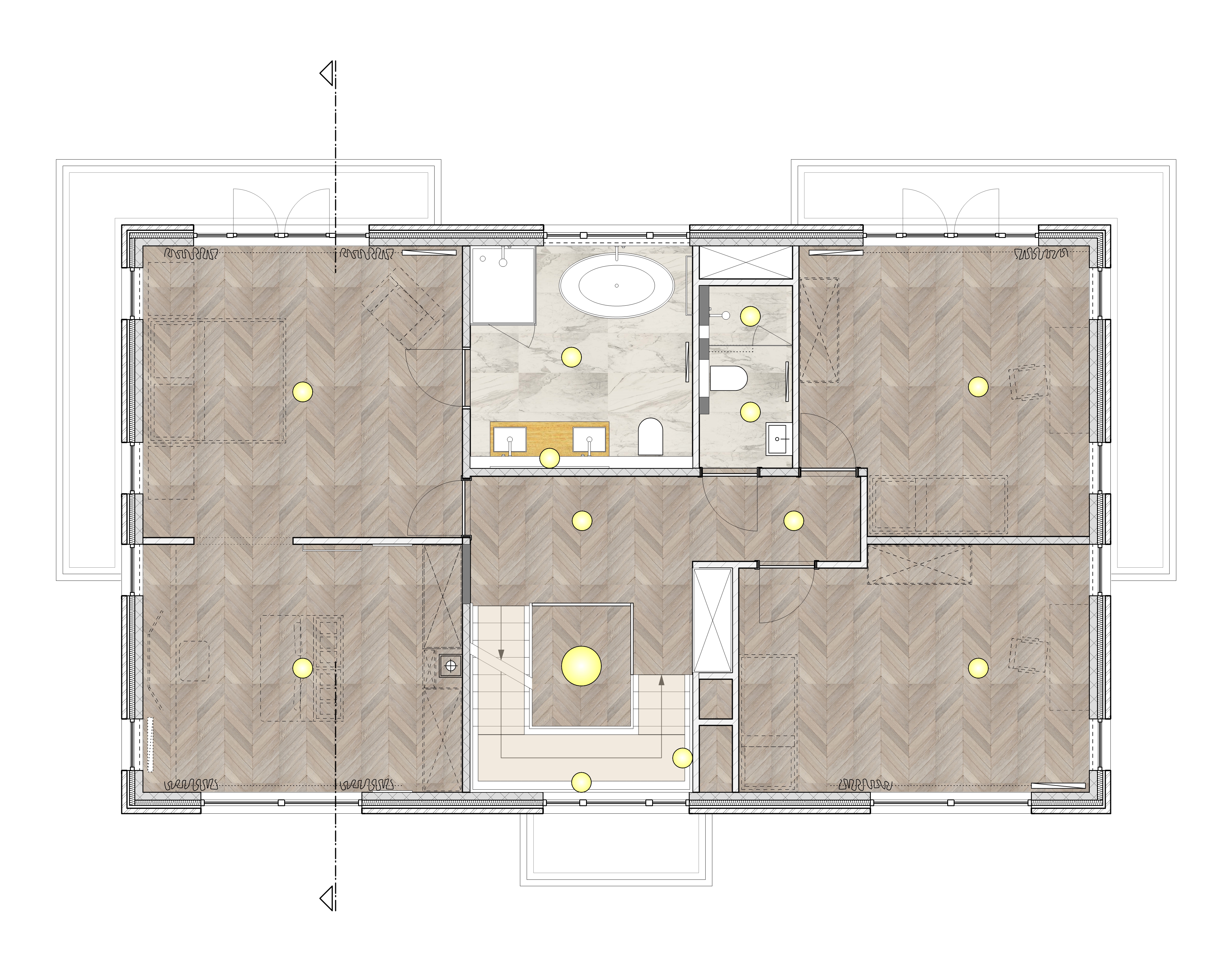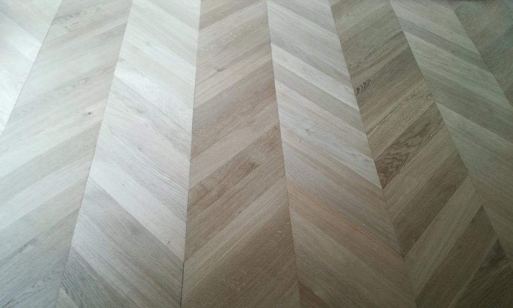 Op de begane grond werd in de bestaande dekvloer vloerverwarming ingefreesd en afgewerkt met een prachtige massief eiken ‘Hongaarse punt’parketvloer die ook op de verdieping terugkomt.
